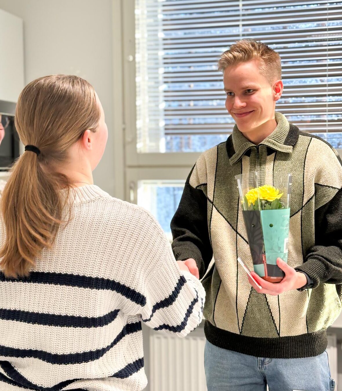 Nuorisotyöryhmän puheenjohtaja Matilda Alanen luovutti kukat ja lahjakortin Topi Saarelle, joka on 500. Nuoriso Leader -rahoituksen saaja.